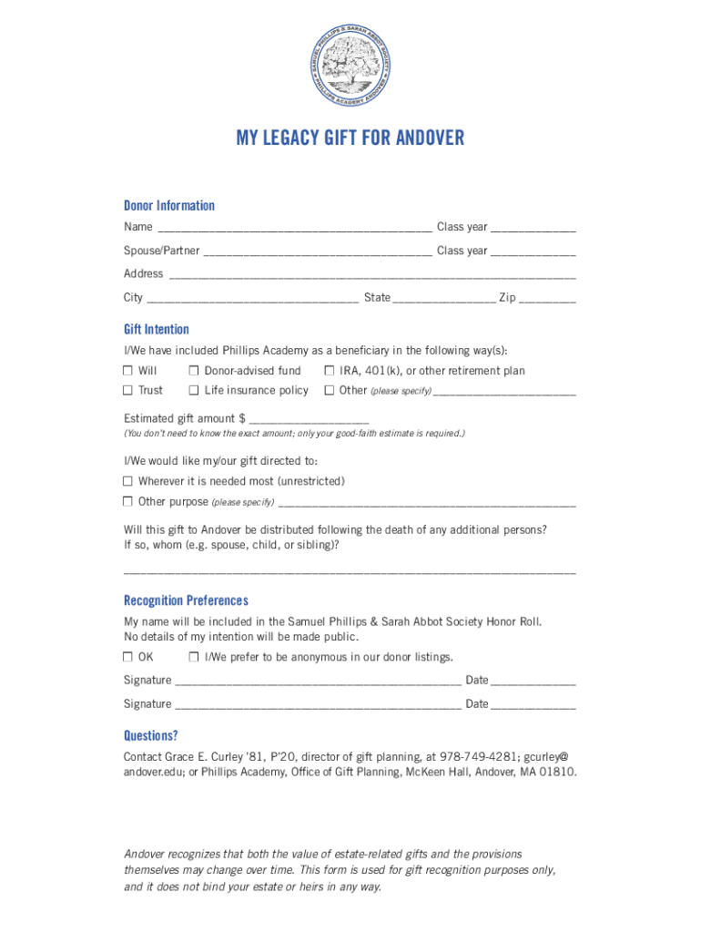 MY LEGACY GIFT FOR ANDOVER Donor Information Name Class year Spouse/Partner Class year Address City State Gift Intention I/We have included Phillips