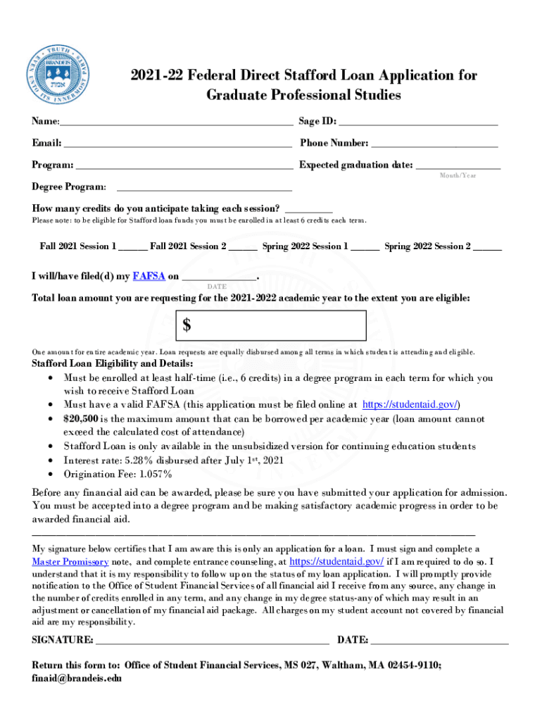 202122 Federal Direct Stafford Loan Application for Graduate Professional Studies Name: Sage ID: Email: Phone Number: Program: Expected graduation date: Month/Microdegree Program: How many credits
