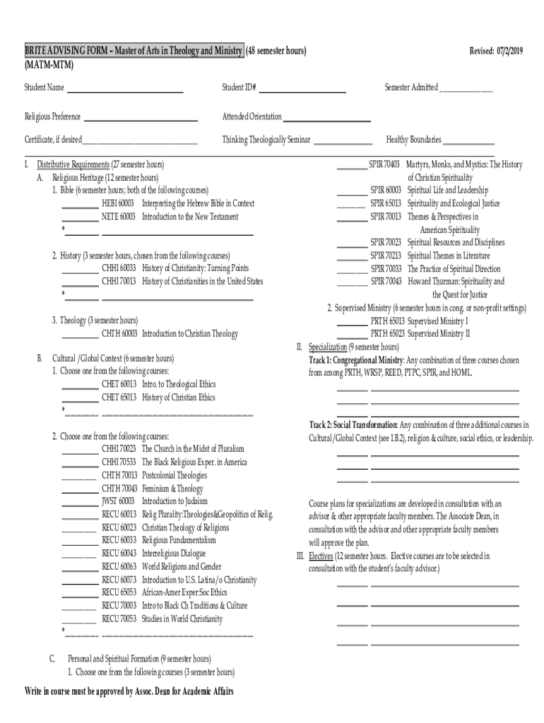 Get the free BRITE ADVISING FORMMaster of Arts in Theology and ...