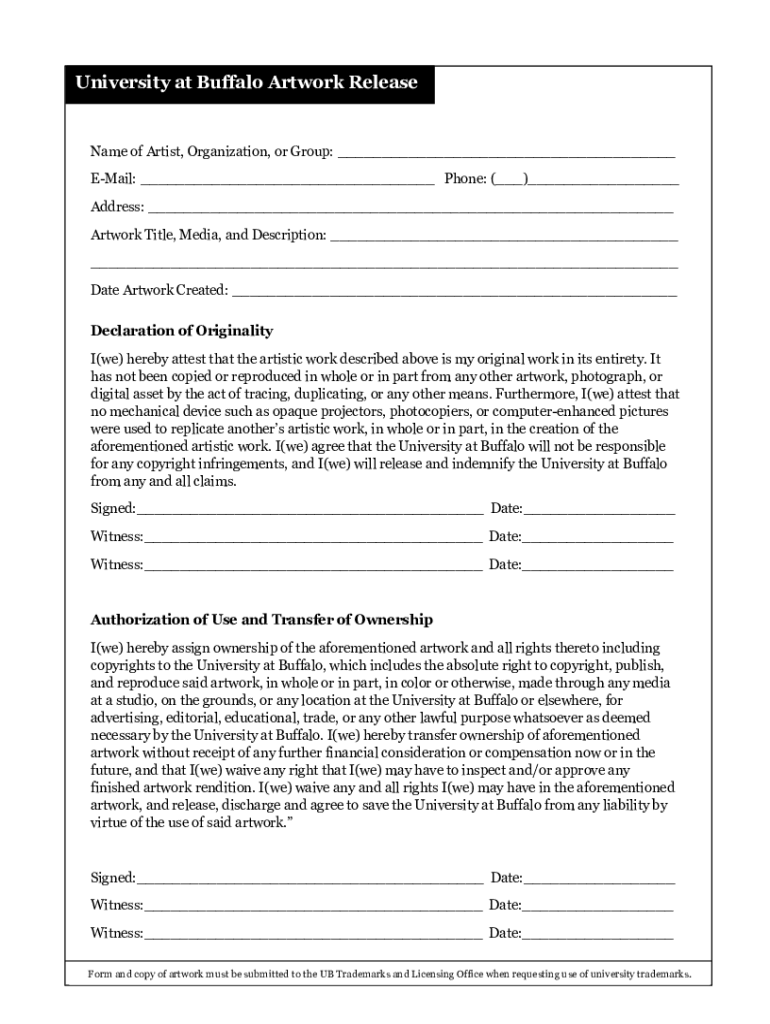 University at Buffalo Artwork ReleaseName of Artist, Organization, or Group: Email: Phone: () Address: Artwork Title, Media, and Description: Date Artwork Created: Declaration of Originality I(we)