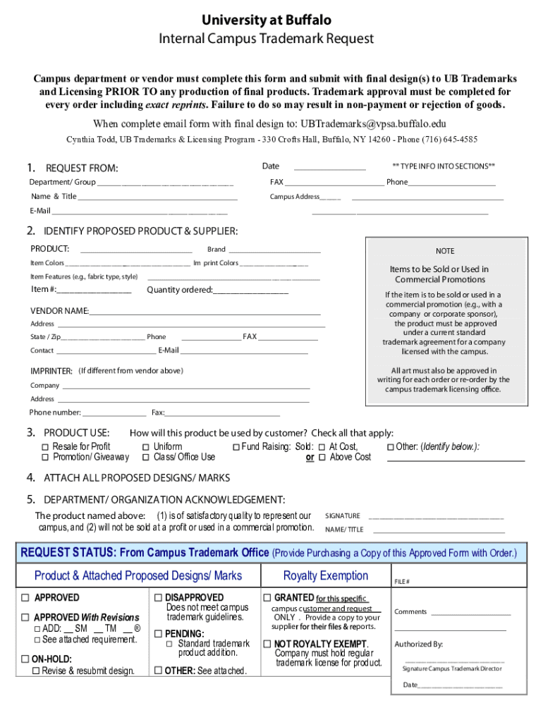 University at Buffalo Internal Campus Trademark Request Campus department or vendor must complete this form and submit with final design(s) to UP Trademarks and Licensing PRIOR TO any production of