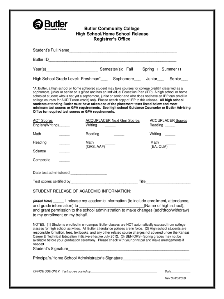 Butler Community College High School/Home School Release Registrars Office Students Full Name Butler ID Year(s) Semester(s): Fall High School Grade Level: Freshman* Sophomore SpringSummerJunior Senior