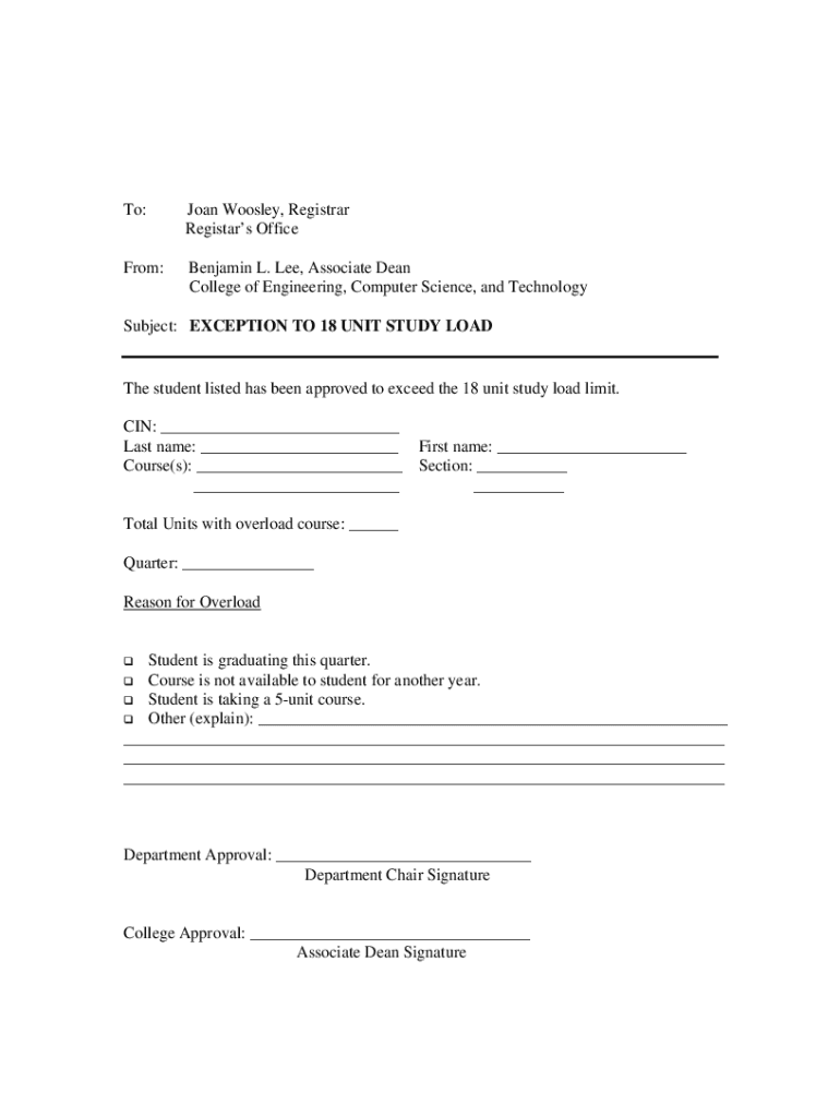To:Joan Loosely, Registrar Registers Officer:Benjamin L. Lee, Associate Dean College of Engineering, Computer Science, and TechnologySubject: EXCEPTION TO 18 UNIT STUDY Loathe student listed has been