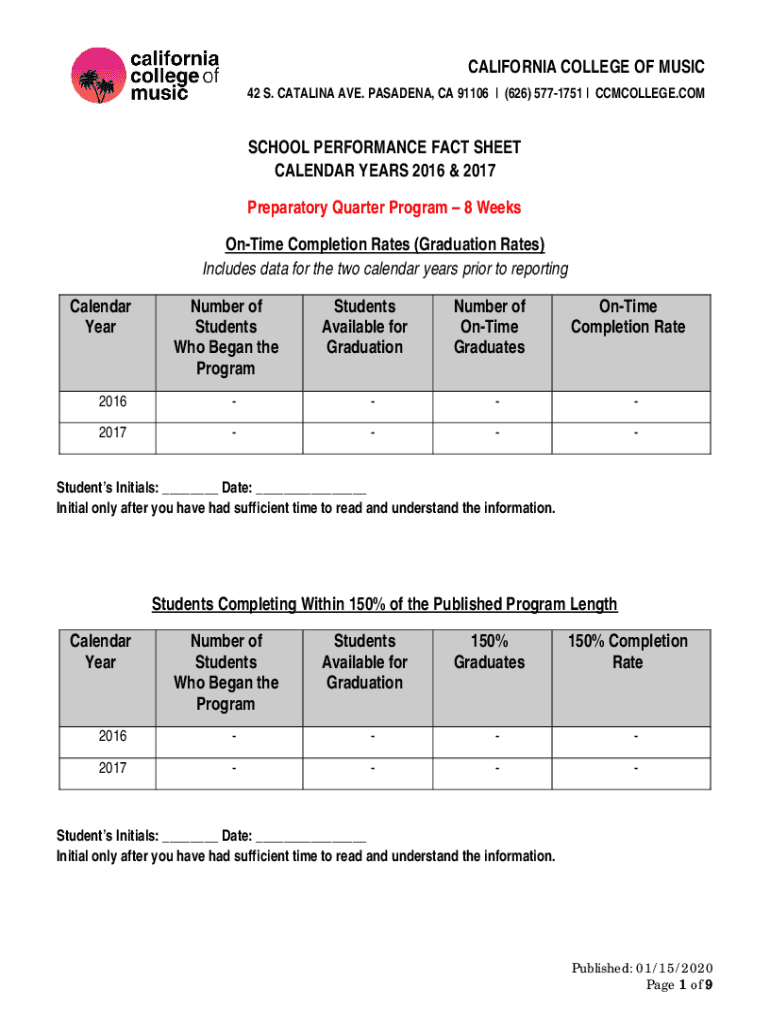 CALIFORNIA COLLEGE OF MUSIC 42 S. CATALINA AVE. PASADENA, CA 91106 | (626) 5771751 | COLLEGE.HOMESCHOOL PERFORMANCE FACT SHEET CALENDAR YEARS 2016 & 2017 Preparatory Quarter Program 8 Weeks Onetime