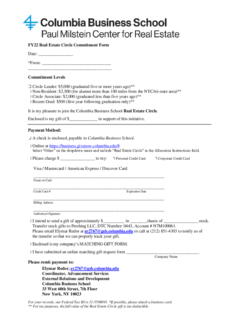 FY22 Real Estate Circle Commitment Form Date: *From: Commitment Levels Circle Leader: $5,000 (graduated five or more years ago)** Nonresident: $2,500 (for alumni more than 100 miles from the NYC/aristate