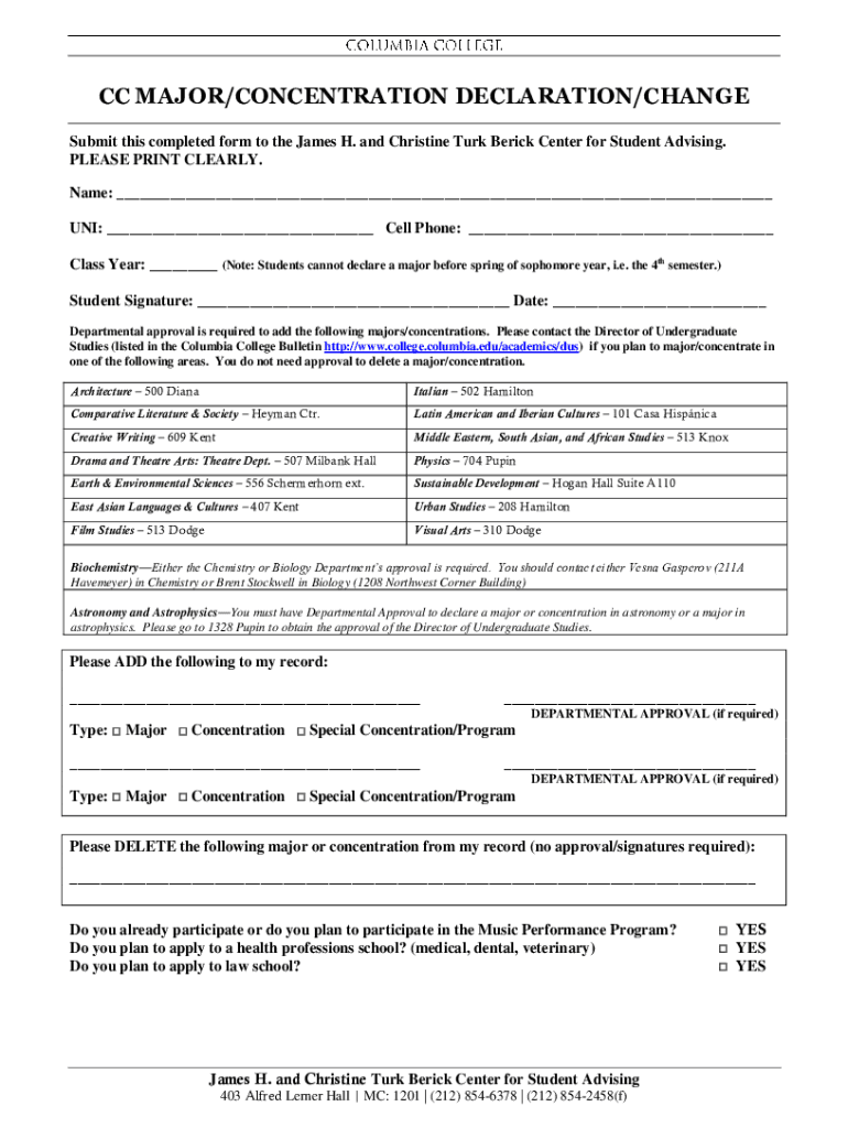 CC MAJOR/CONCENTRATION DECLARATION/CHANGE Submit this completed form to the James H. and Christine Turk Brick Center for Student Advising. PLEASE PRINT CLEARLY. Name: UNI: Cell Phone: Class Year:
