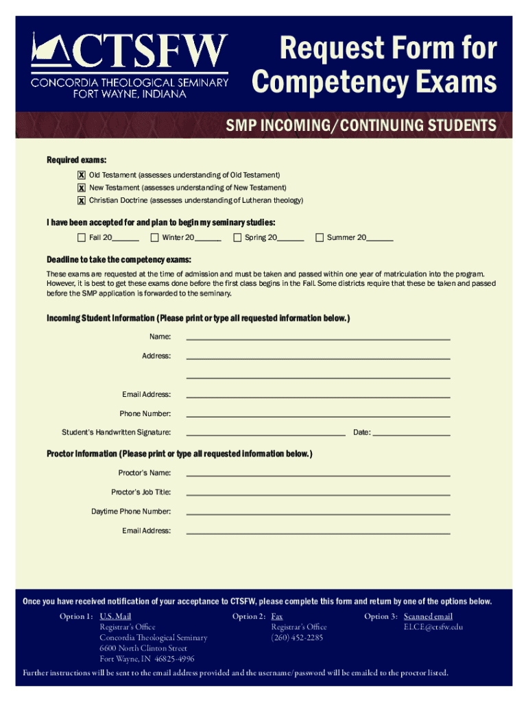 Request Form for Competency Exams SVP INCOMING/CONTINUING STUDENTS Required exams: c x Old Testament (assesses understanding of Old Testament) c x New Testament (assesses understanding of New Testament)