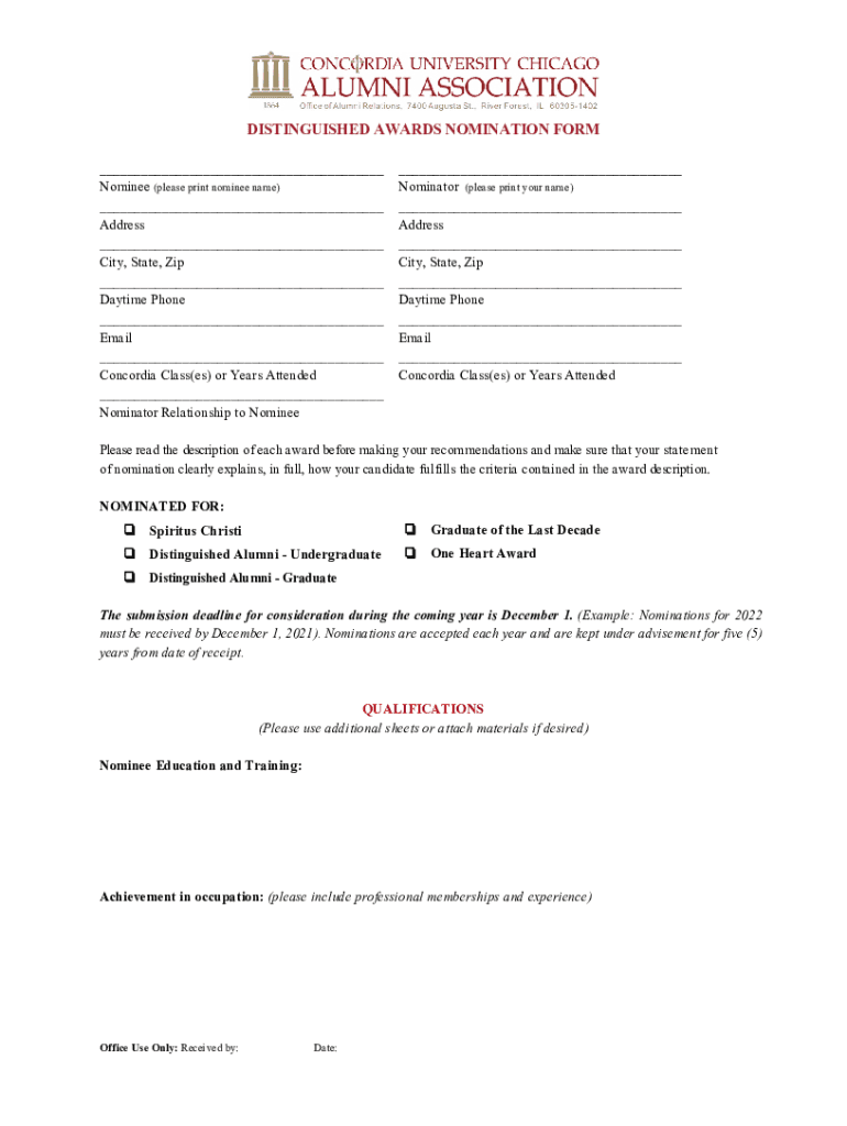 Distinguished Awards Nomination Form Concordia University Chicago's Alumni Association annually honors individuals who have made outstanding contributions to their fields of endeavor, their communities,