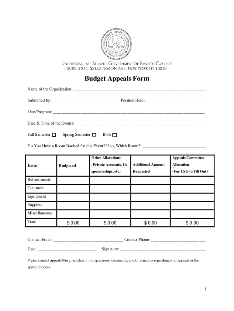 Budget Appeals Form Name of the Organization: Submitted by: Position Held: Line/Program: Date & Time of the Events: Fall Semester Spring Semester Both Do You Have a Room Booked for this Event? If