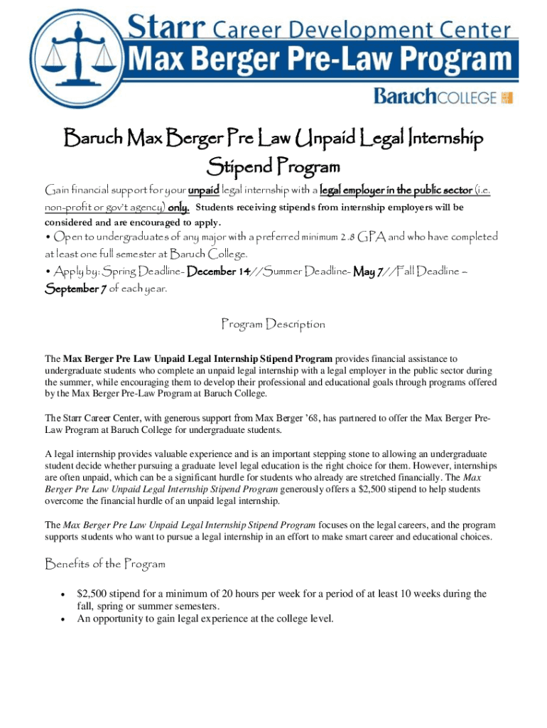 Baruch Max Berger PRE Law Unpaid Legal Internship Stipend Program Gain financial support for your unpaid legal internship with a legal employer in the public sector (i.e. nonprofit or govt agency)