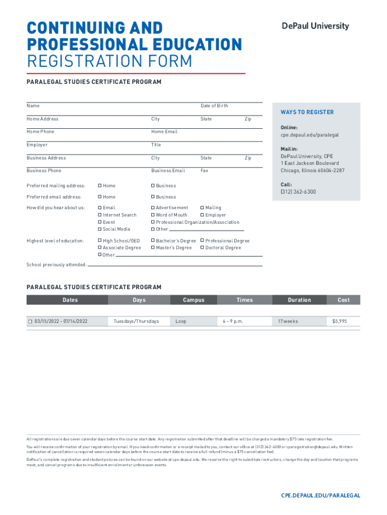 CONTINUING AND PROFESSIONAL EDUCATION REGISTRATION FORMDePaul UniversityPARALEGAL STUDIES CERTIFICATE PROGRAMNameDate of Birthrate AddressCityStateHome Phoneme EmailEmployerTitleBusiness AddressCityStateBusiness