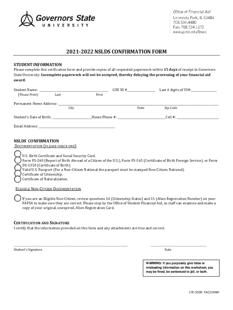 20212022 HOLDS CONFIRMATION FORM STUDENT INFORMATIONPlease complete this verification form and provide copies of all requested paperwork within 15 days of receipt to Governors State University. Incomplete