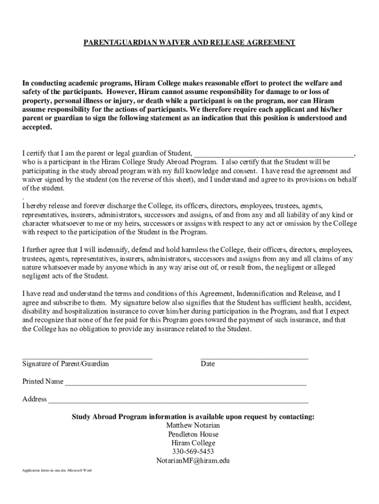 PARENT/GUARDIAN WAIVER AND RELEASE AGREEMENT In conducting academic programs, Hiram College makes reasonable effort to protect the welfare and safety of the participants. However, Hiram cannot assume