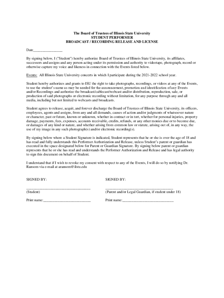 The Board of Trustees of Illinois State University STUDENT PERFORMER BROADCAST / RECORDING RELEASE AND LICENSE Date By signing below, I (“Student “) hereby authorize Board of Trustees of Illinois