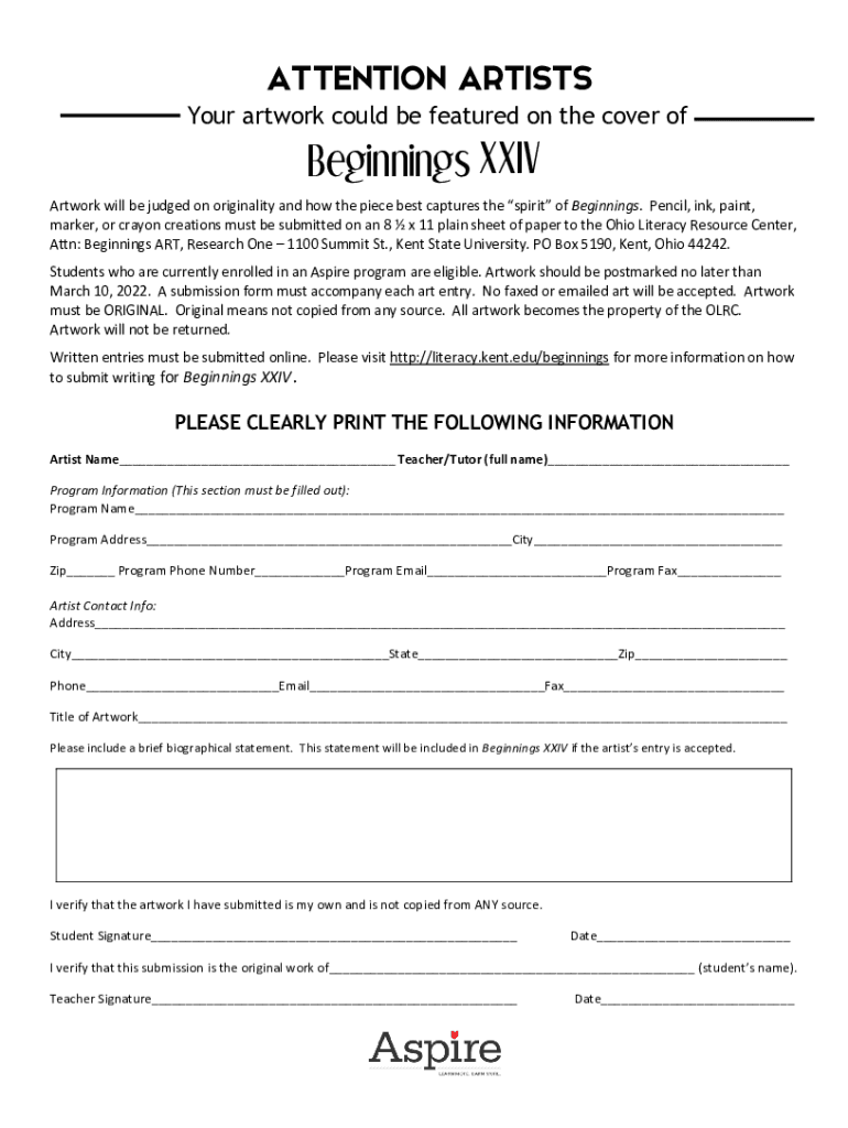 ATTENTION ARTISTSYour artwork could be featured on the cover beginnings XXIV Artwork will be judged on originality and how the piece best captures the spirit of Beginnings. Pencil, ink, paint, marker,