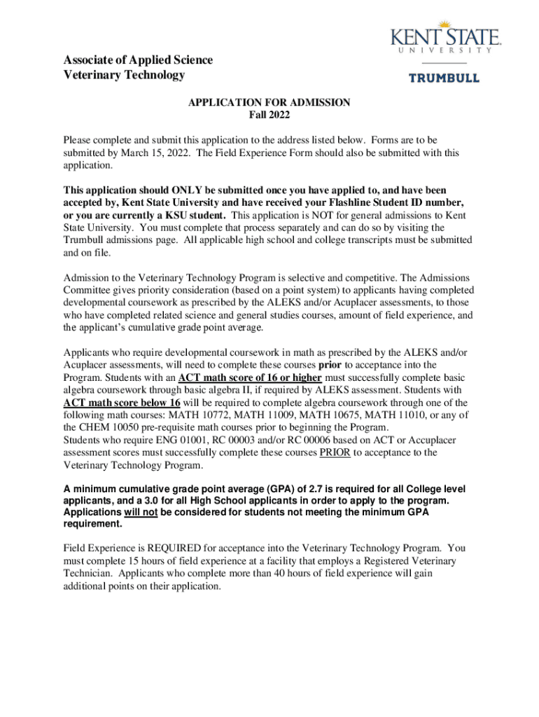 Associate of Applied Science Veterinary Technology APPLICATION FOR ADMISSION Fall 2022 Please complete and submit this application to the address listed below. Forms are to be submitted by March 15,
