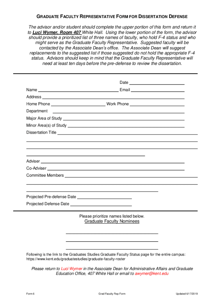 Get the free GRADUATE FACULTY REPRESENTATIVE FORM FOR DISSERTATION DEFENSE