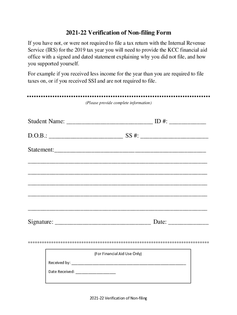 202122 Verification of Nonfiling Form If you have not, or were not required to file a tax return with the Internal Revenue Service (IRS) for the 2019 tax year you will need to provide the KCC financial