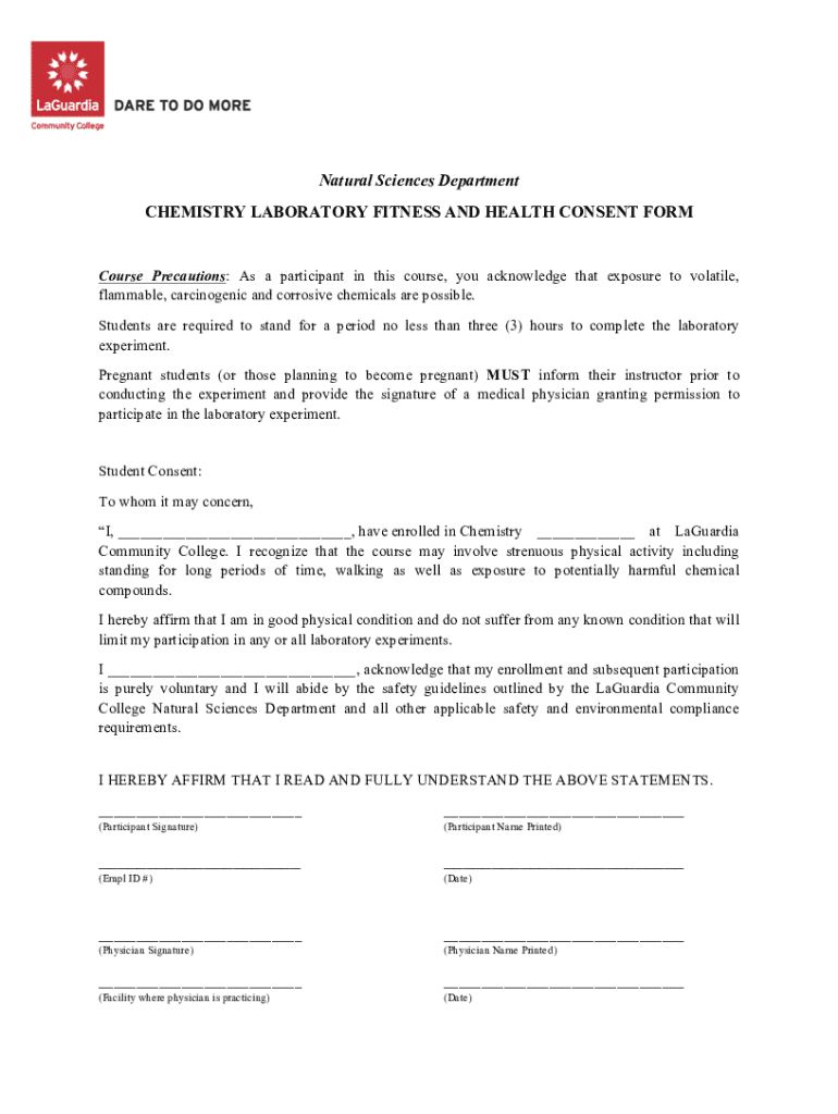 Natural Sciences Department CHEMISTRY LABORATORY FITNESS AND HEALTH CONSENT Concourse Precautions: As a participant in this course, you acknowledge that exposure to volatile, flammable, carcinogenic