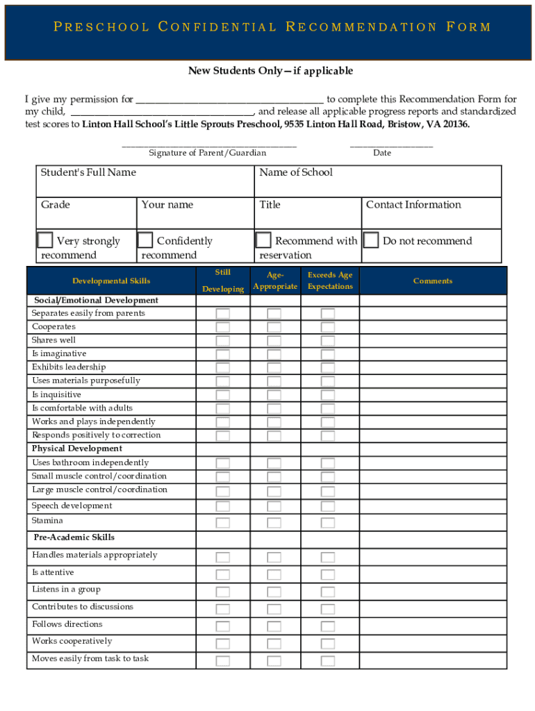 PRESCHOOL CONFIDENTIAL RECOMMENDATION FORM New Students Only if applicable I give my permission for to complete this Recommendation Form for my child, and release all applicable progress reports and