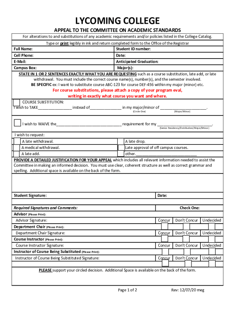 LYCOMING COLLEGE APPEAL TO THE COMMITTEE ON ACADEMIC STANDARDS For alterations to and substitutions of any academic requirements and/or policies listed in the College Catalog. Type or print legibly