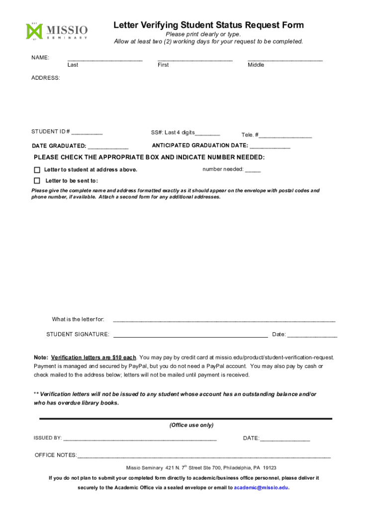 Letter Verifying Student Status Request Form Please print clearly or type. Allow at least two (2) working days for your request to be completed.NAME: Last First MiddleADDRESS:STUDENT ID # SS#: Last
