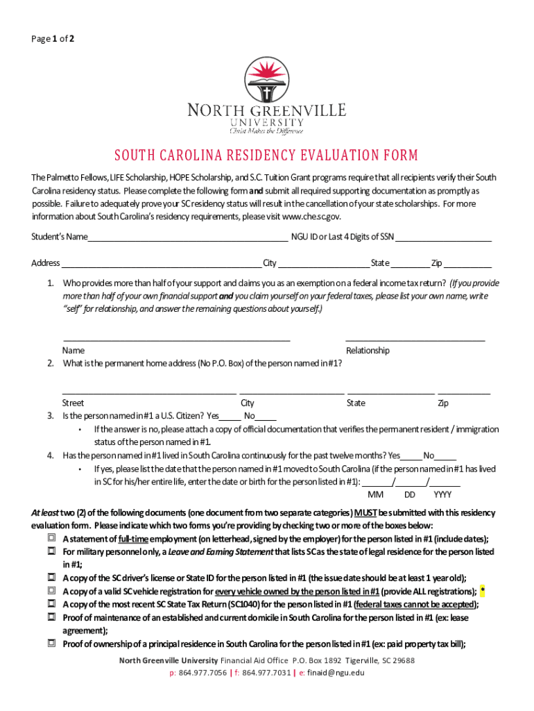 Page 1 of 2SOUTH CAROLINA RESIDENCY EVALUATION FORM The Palmetto Fellows, LIFE Scholarship, HOPE Scholarship, and S.C. Tuition Grant programs require that all recipients verify their South Carolina