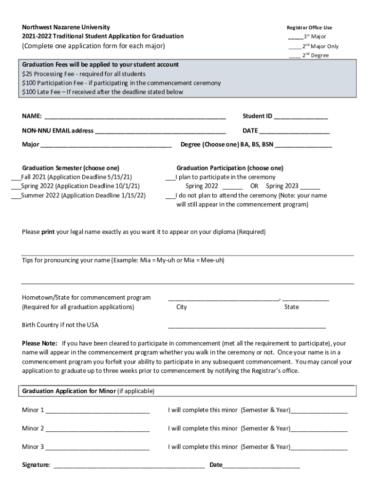 Northwest Nazarene University 20212022 Traditional Student Application for GraduationRegistrar Office Use 1st Major(Complete one application form for each major) 2nd Major Only 2nd DegreeGraduation