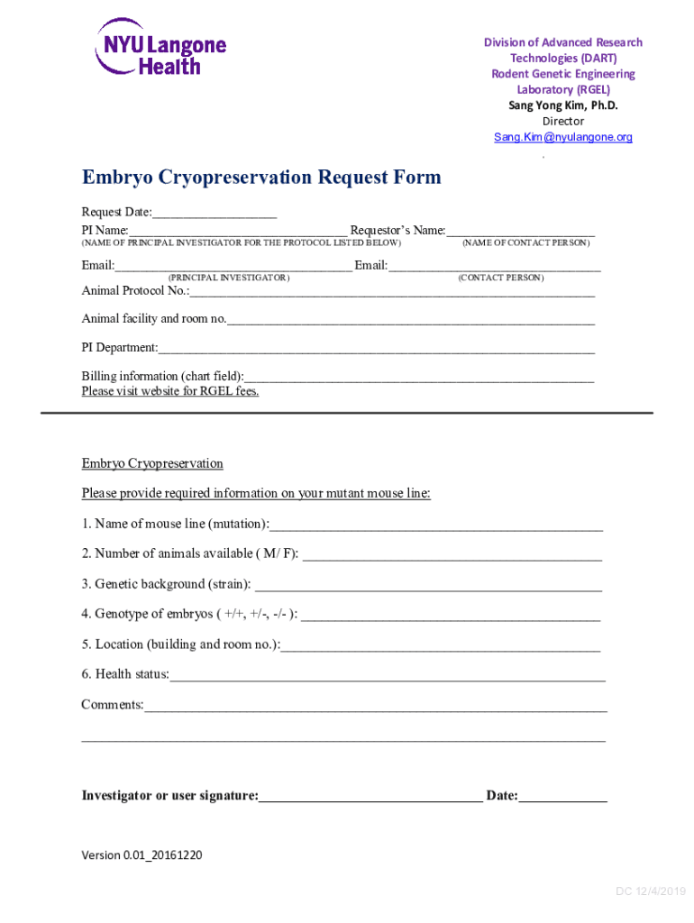 Division of Advanced Research Technologies (DART) Rodent Genetic Engineering Laboratory (REEL) Sang Yong Kim, Ph.D. Director Sang. Kim nyulangone. Embryo Cryopreservation Request Form Request Date: