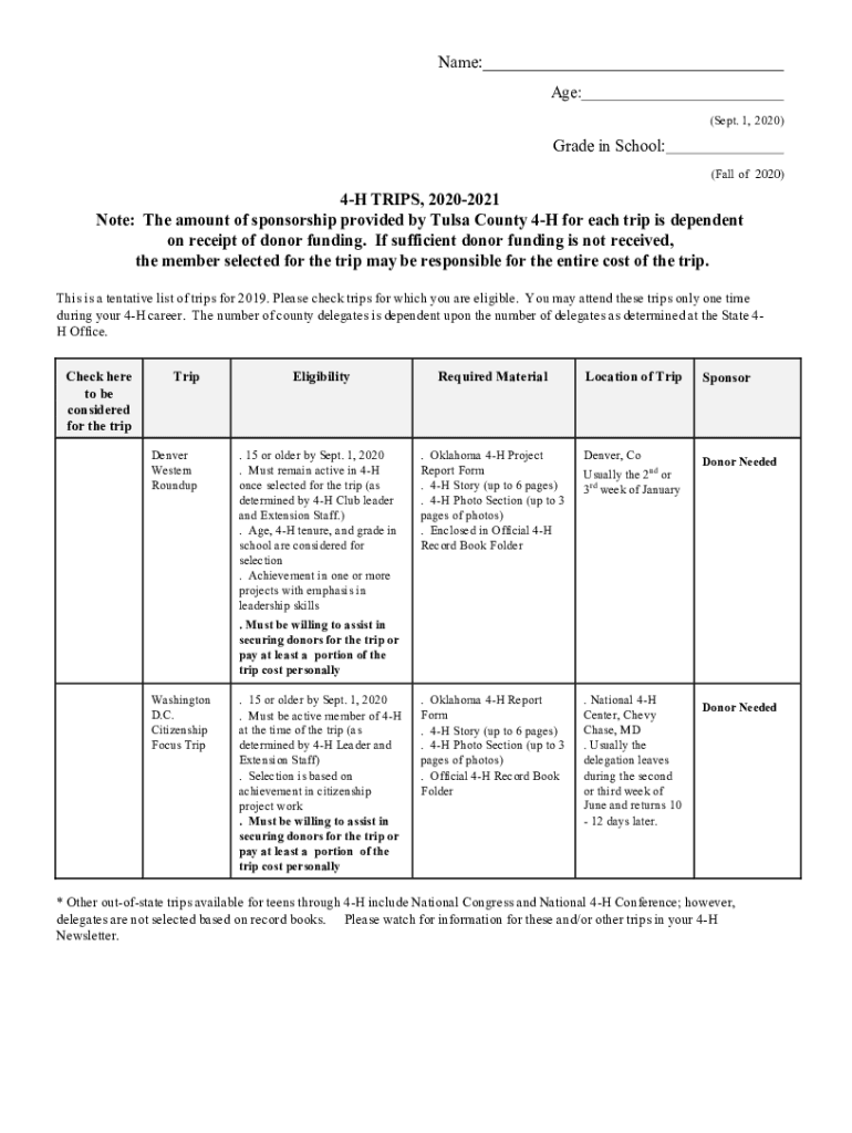Name: Age: (Sept. 1, 2020)Grade in School: (Fall of 2020)4H TRIPS, 20202021 Note: The amount of sponsorship provided by Tulsa County 4H for each trip is dependent on receipt of donor funding. If sufficient