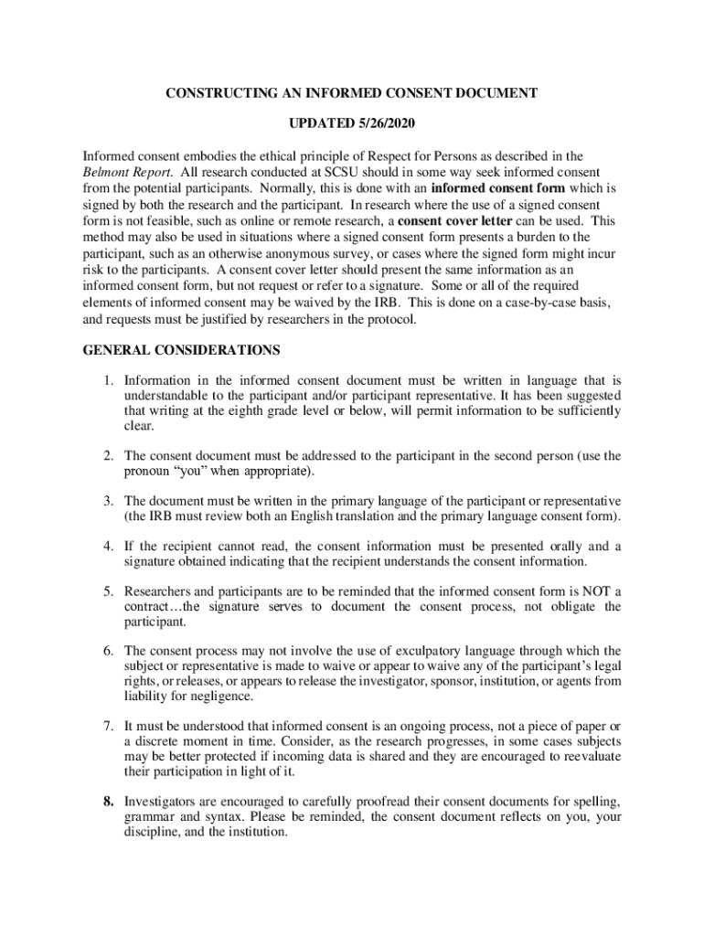 CONSTRUCTING AN INFORMED CONSENT DOCUMENT UPDATED 5/26/2020 Informed consent embodies the ethical principle of Respect for Persons as described in the Belmont Report. All research conducted at CSU