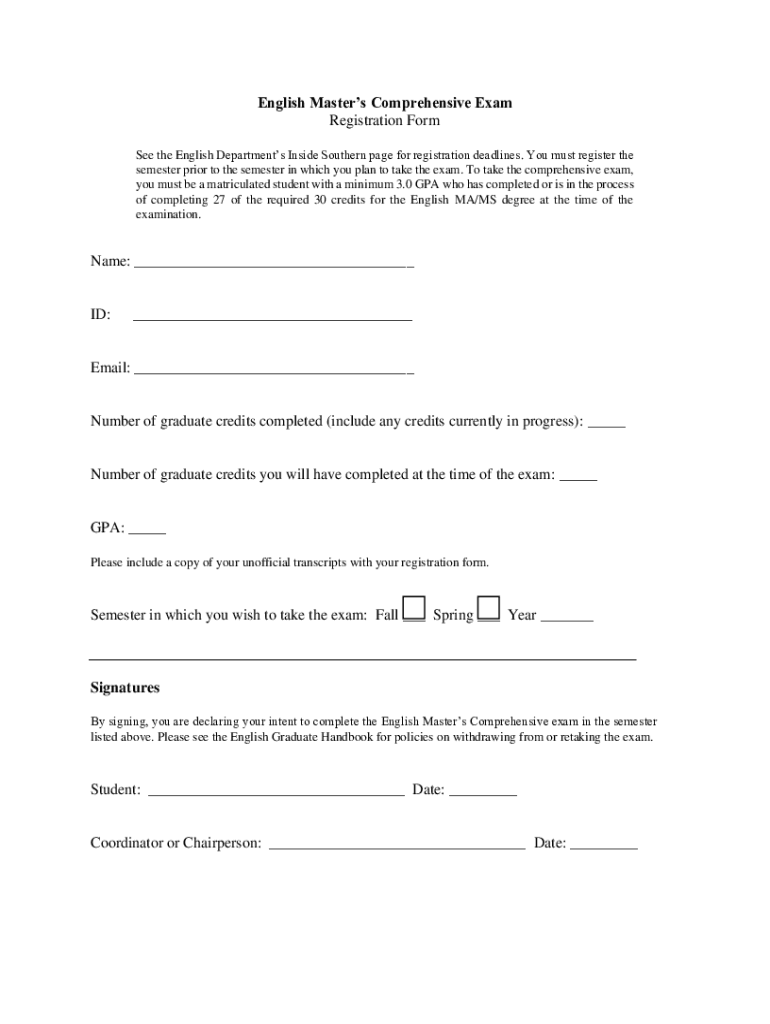 English Masters Comprehensive Exam Registration Form See the English Departments Inside Southern page for registration deadlines. You must register the semester prior to the semester in which you