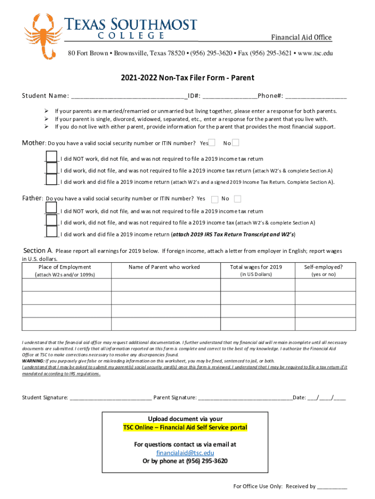 Get the free 2019-2020 Non-Tax Filer Form Parent - archive.tsc.edu