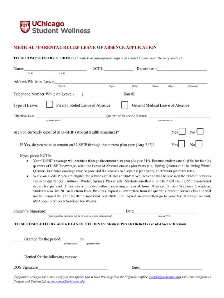 MEDICAL / PARENTAL RELIEF LEAVE OF ABSENCE APPLICATION TO BE COMPLETED BY STUDENT: Complete as appropriate, sign, and submit to your area Dean of Students. Name: (First)ACID: Department: (Last)Address