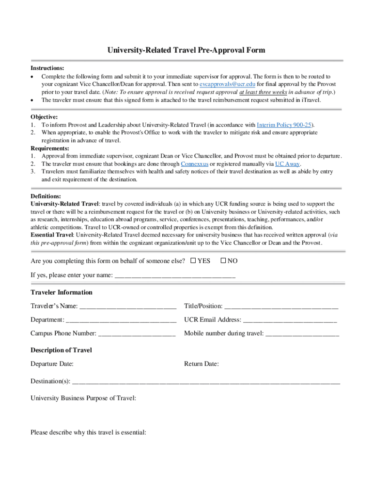 UniversityRelated Travel PreApproval Form Instructions: Complete the following form and submit it to your immediate supervisor for approval. The form is then to be routed to your cognizant Vice Chancellor/Dean