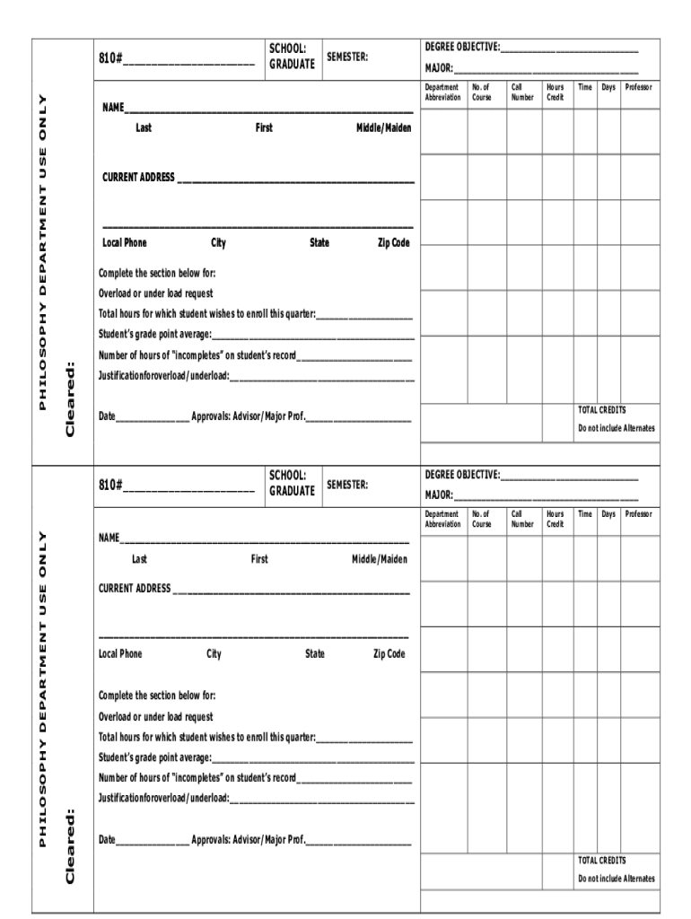 SCHOOL: GRADUATELastFirstMAJOR: Middle/MaidenDepartment Abbreviation No. of Curveball Numerous CreditTimeDaysProfessorCURRENT ADDRESS Local PhoneCityStateZip CodeComplete the section below for: Overload