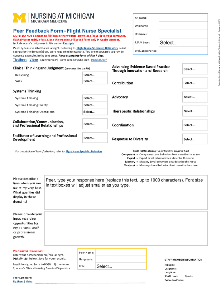 Unique:Peer Feedback Form Flight Nurse SpecialistNOTE: DO NOT attempt to fill form on the website. Download (save) it to your computer, flash drive or H drive first. Close the website. Fill saved