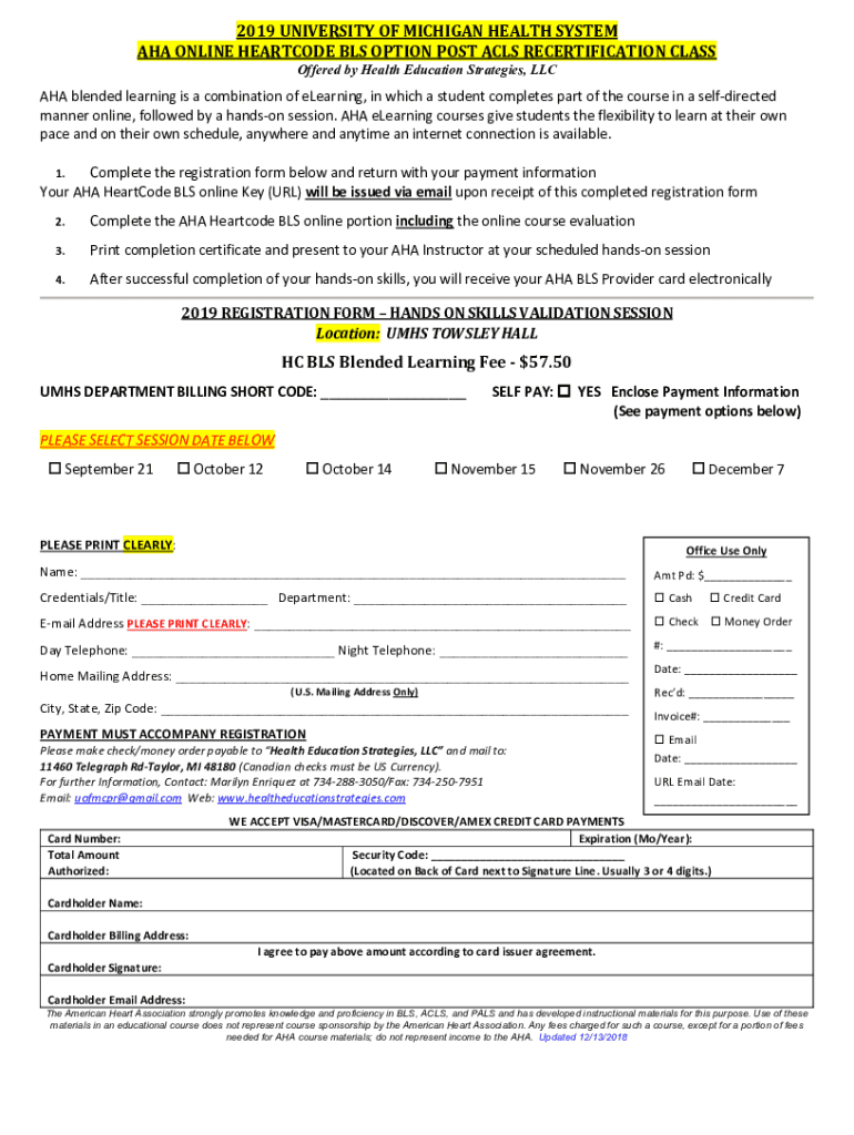 2019 UNIVERSITY OF MICHIGAN HEALTH SYSTEM AHA ONLINE HEARTWOOD BLS OPTION POST ACLs RECERTIFICATION CLASS Offered by Health Education Strategies, LLC AHA blended learning is a combination of e-learning,