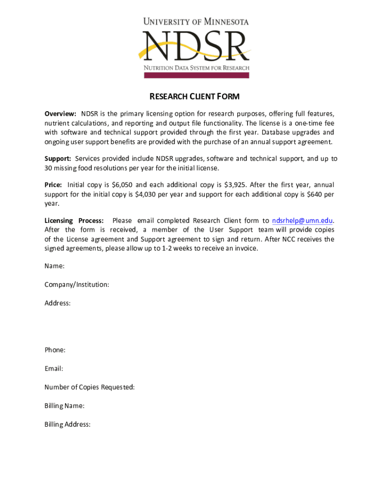 RESEARCH CLIENT FORM Overview:NDSRistheprimarylicensingoptionforresearchpurposes, offeringfullfeatures, nutrient calculations, and reporting and output file functionality. The license is a onetime