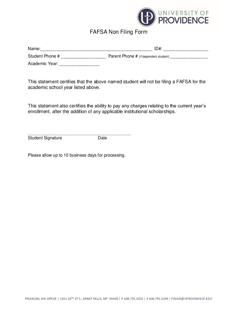 FAFSA Non Filing Form Name: ID#: Student Phone # Parent Phone # (if dependent student) Academic Year: This statement certifies that the above named student will not be filing a FAFSA for the academic