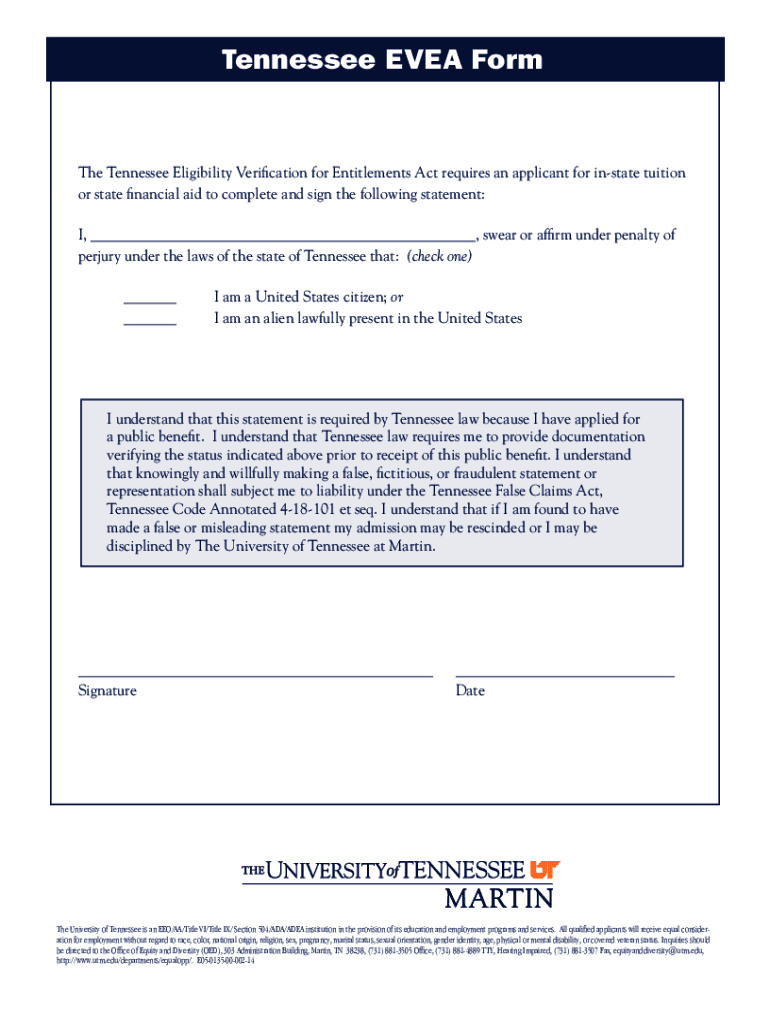 Tennessee EVEN Forth Tennessee Eligibility Verification for Entitlements Act requires an applicant for instate tuition or state financial aid to complete and sign the following statement: I, swear