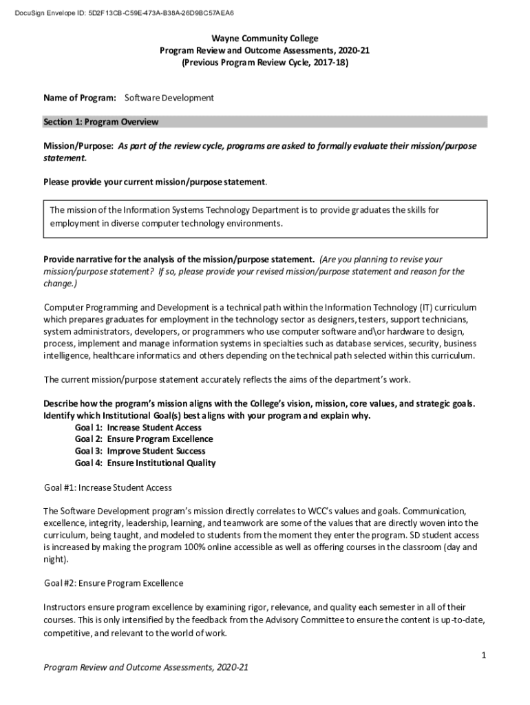 DocuSign Envelope ID: 5D2F13CBC59E473AB38A26D9BC57AEA6Wayne Community College Program Review and Outcome Assessments, 202021 (Previous Program Review Cycle, 201718) Name of Program: Software Development