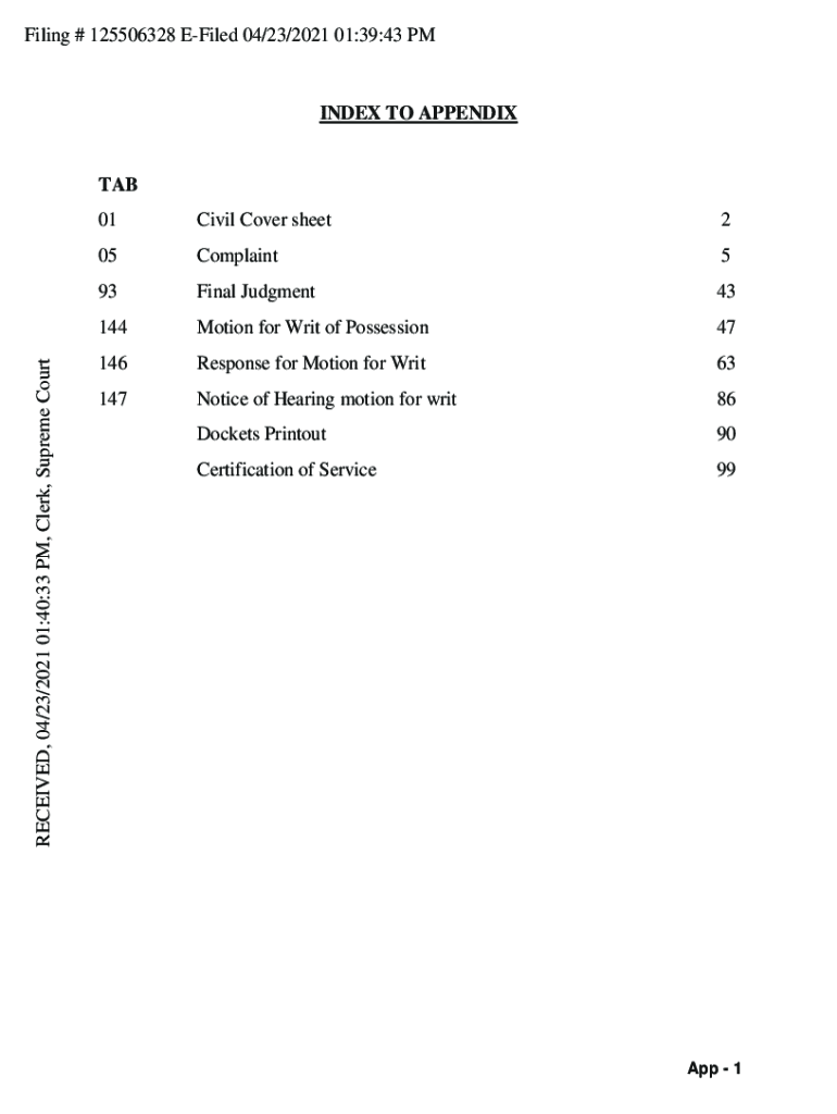 Filing # 125506328 Filed 04/23/2021 01:39:43 INDEX TO APPENDIXRECEIVED, 04/23/2021 01:40:33 PM, Clerk, Supreme Court 01Civil Cover sheet205Complaint593Final Judgment43144Motion for Writ of Possession47146Response