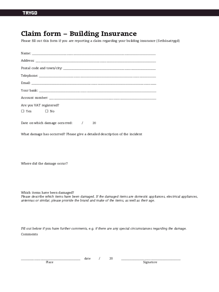 Claim form Building Insurance Please fill out this form if you are reporting a claim regarding your building insurance (Sethsatrygd)Name: Address: Postal code and town/city: Telephone: Email: Your