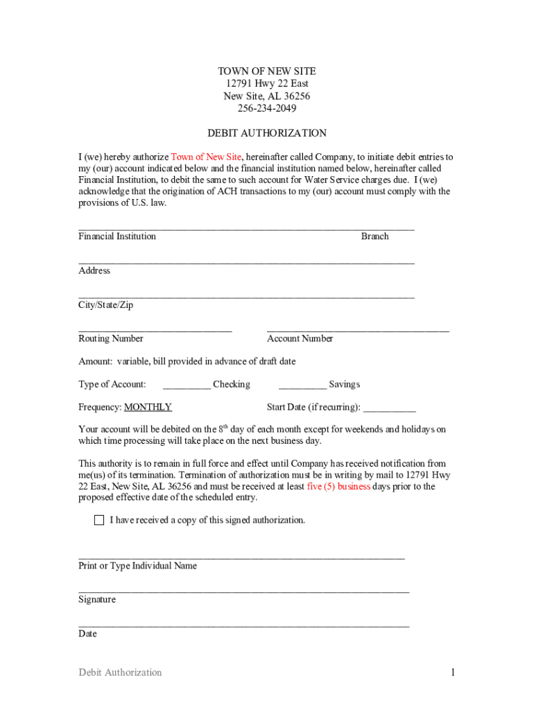 TOWN OF NEW SITE 12791 Hwy 22 East New Site, AL 36256 2562342049 DEBIT AUTHORIZATION I (we) hereby authorize Town of New Site, hereinafter called Company, to initiate debit entries to my (our) account