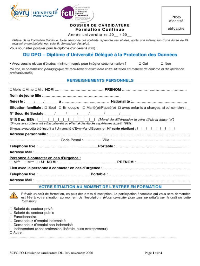 Photo d 'identity DOSSIER DE CANDIDATUREobligatoireFormation Continue A n n e u n i v e r s i t an i r e 20 / 20 Reeve de la Formation Continue, route personnel quit suite Legendre SES tubes, APRS