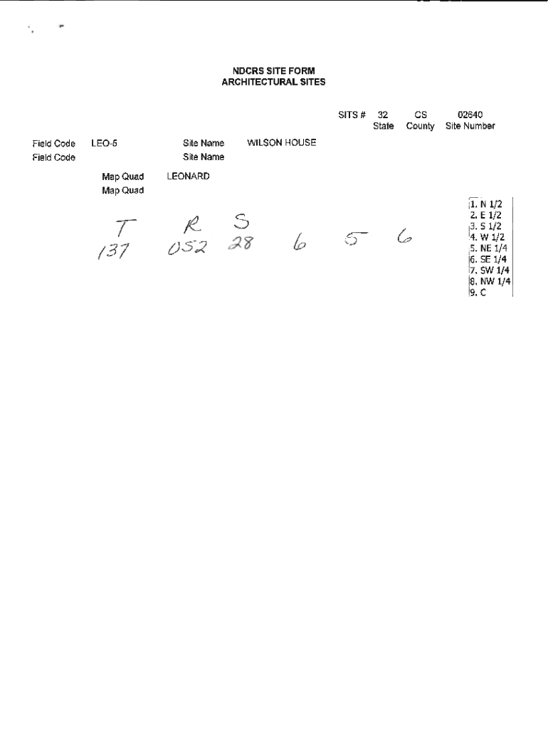 ND CRS SITE FORM ARCHITECTURAL SITES SITS # Field CodeLEO5Site Name32 States County02640 Site NumberWILSON HOUSES ite Masefield Code Map QuadLEONARDMap Quad i 37/t 0S2s ?661. 2. 3. 4. 5. 6. 7. 8.