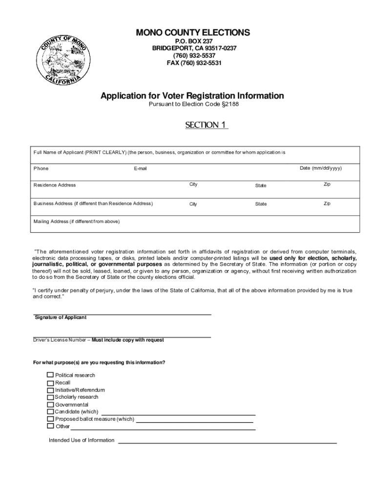 MONO COUNTY ELECTIONS P.O. BOX 237 BRIDGEPORT, CA 935170237 (760) 9325537 FAX (760) 9325531Application for Voter Registration Information Pursuant to Election Code 2188SECTION 1 Full Name of Applicant