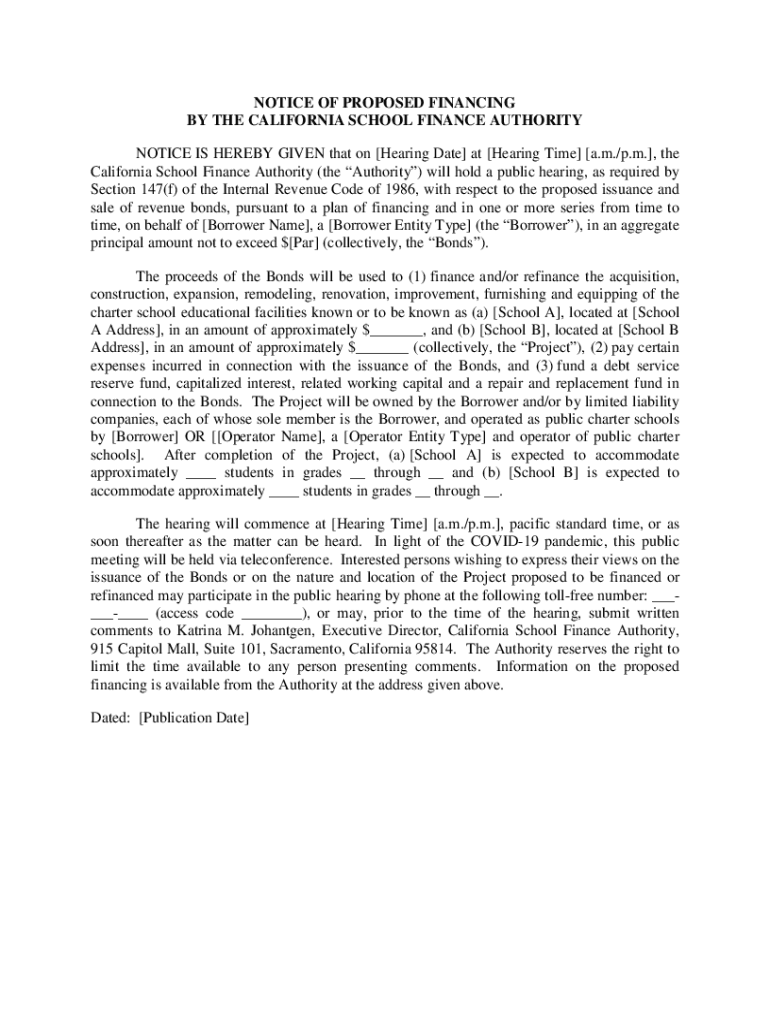 NOTICE OF PROPOSED FINANCING BY THE CALIFORNIA SCHOOL FINANCE AUTHORITY NOTICE IS HEREBY GIVEN that on Hearing Date at Hearing Time a.m./p.m. , the California School Finance Authority (the Authority)