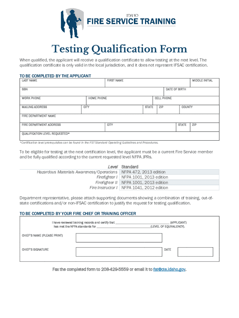 Testing Qualification Form When qualified, the applicant will receive a qualification certificate to allow testing at the next level. The qualification certificate is only valid in the local jurisdiction,